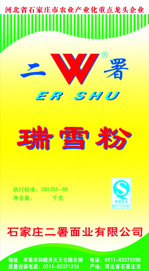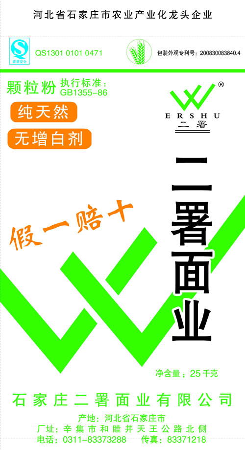 河北面業         二署面業有限公司創建于1989年,現已具備日處理小麥300噸的能量,產品質量穩定,深受客戶青睞。 二署面業地理位置優越,北靠307國道石黃高速,南鄰石德鐵路,衡井國道,交通十分方便,為貨物運輸提供保證及時運輸的天然條件。產品運銷:黑龍江、吉林、遼寧、河北、內蒙、陜西、山西等大中省份,贏得了廣大消費者的認可。 河北面業